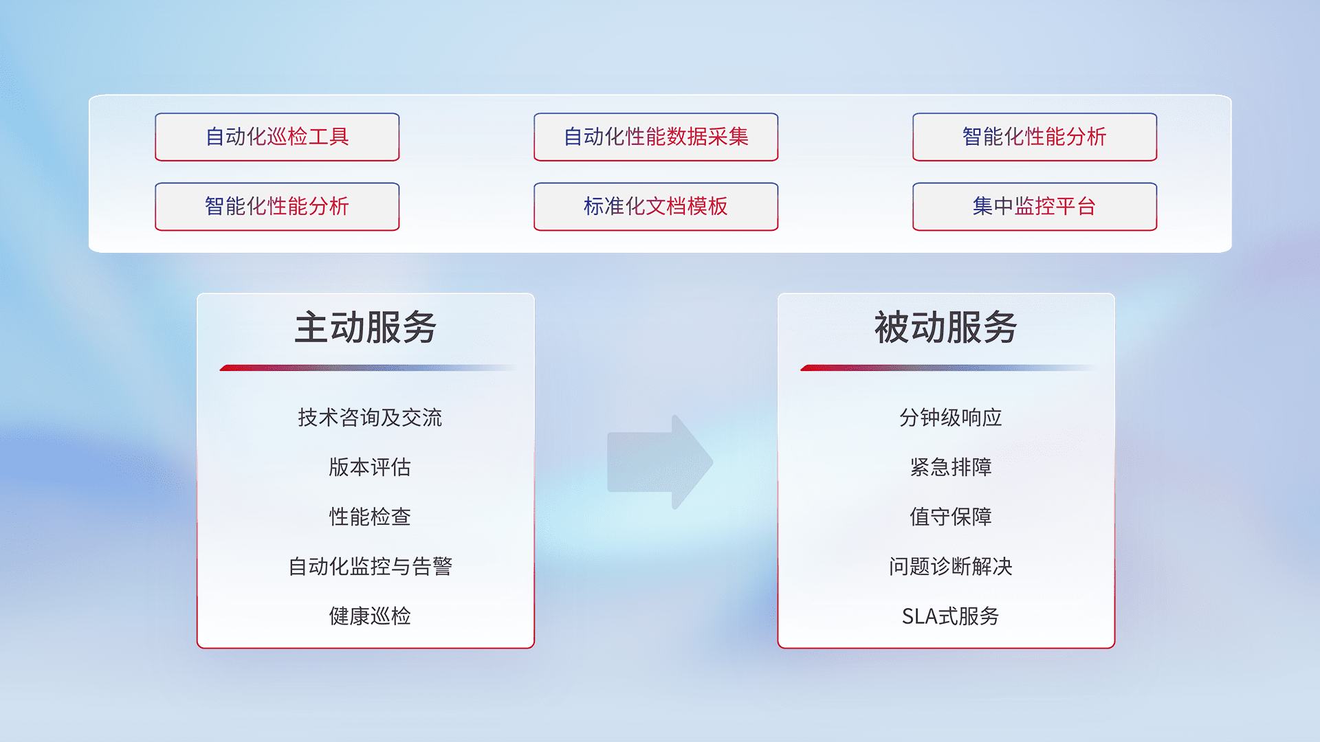 智能化工具和标准化文档,,,保障服务质量,,提供主动服务(包含技术咨询、、、、版本评估、、性能检查、、自动化监控与告警、、健康巡检)和被动服务包含(分钟级响应、、紧急排障、、、值守保障、、问题诊断解决、、SLA服务)。。。