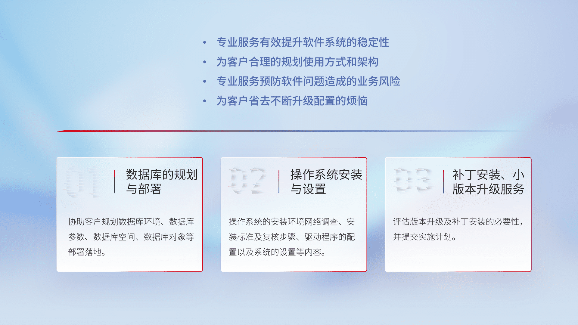 为客户提供软件规模升级、、、、快速部署、、、、按需配置的专业服务,,,从数据库的规划与部署到操作系统的安装与设置,,,,再到补丁安装和小版本升级提供支持。。